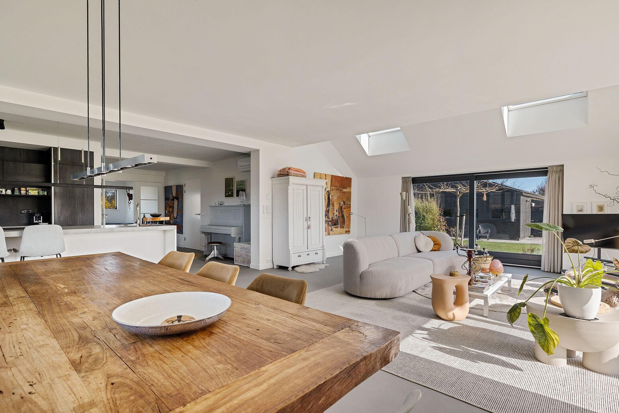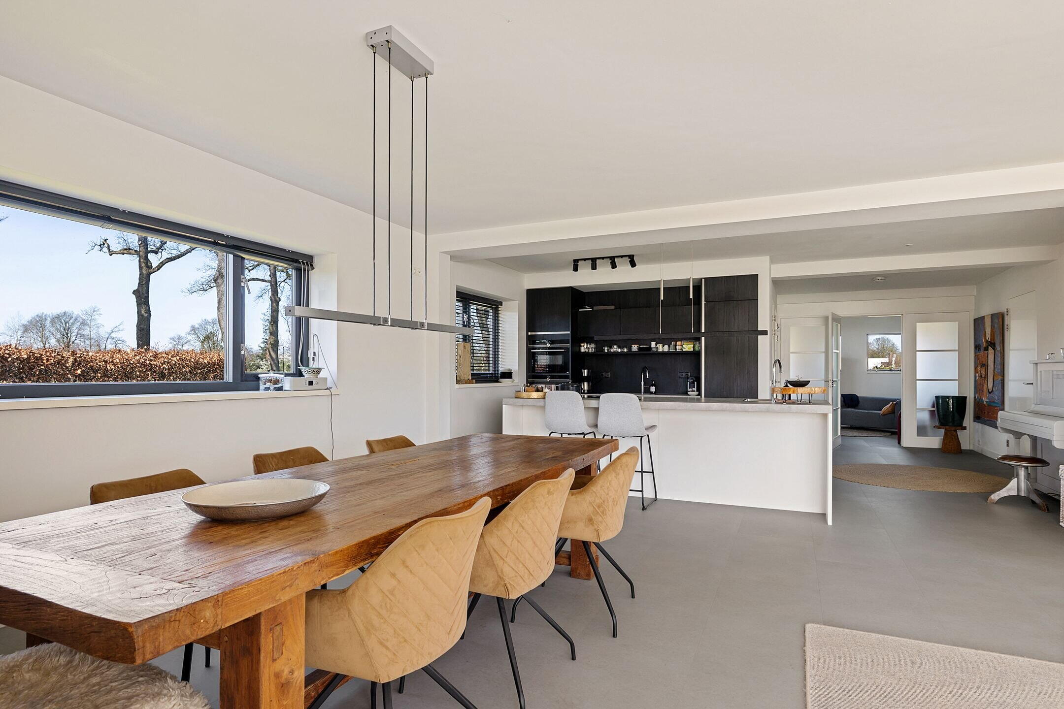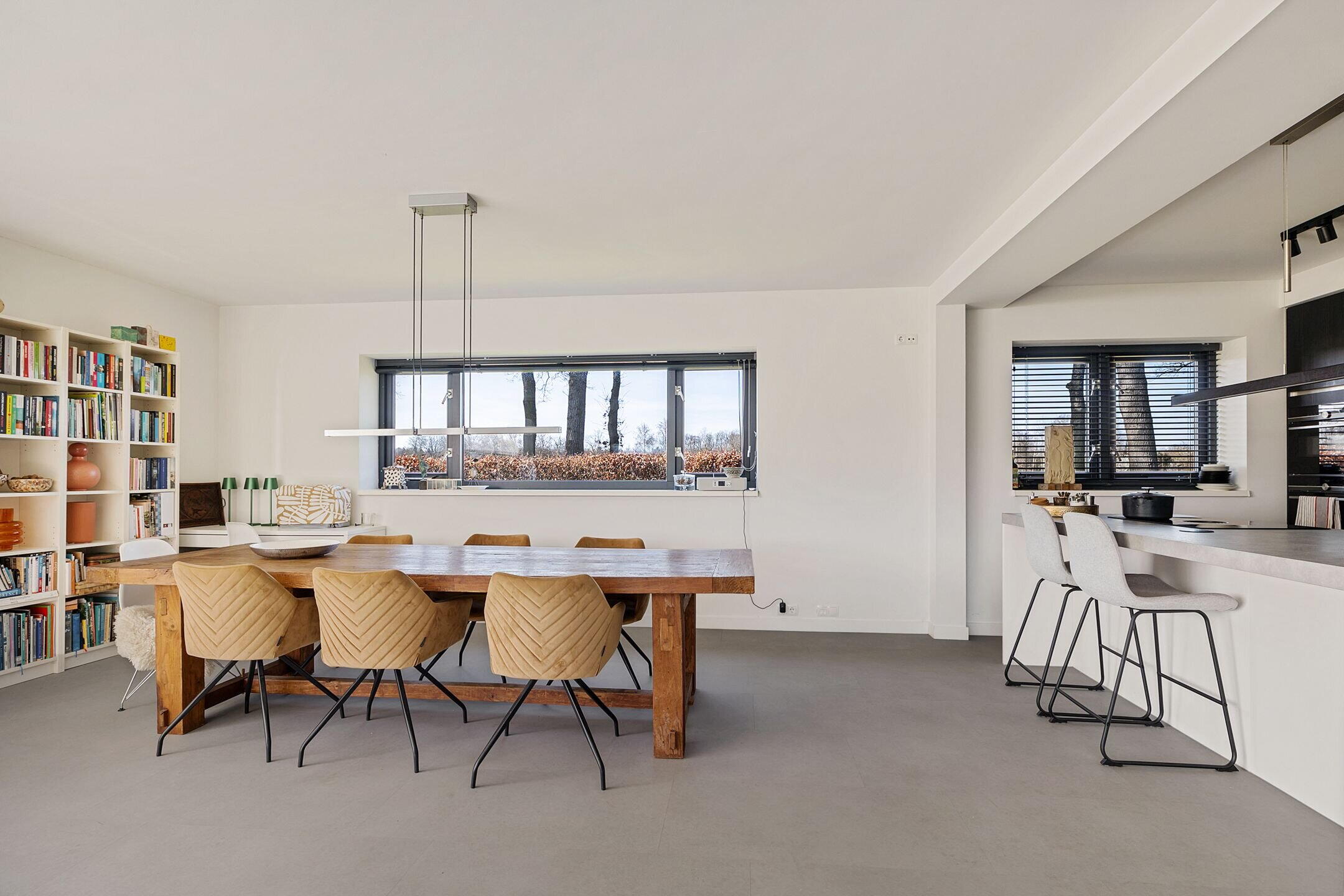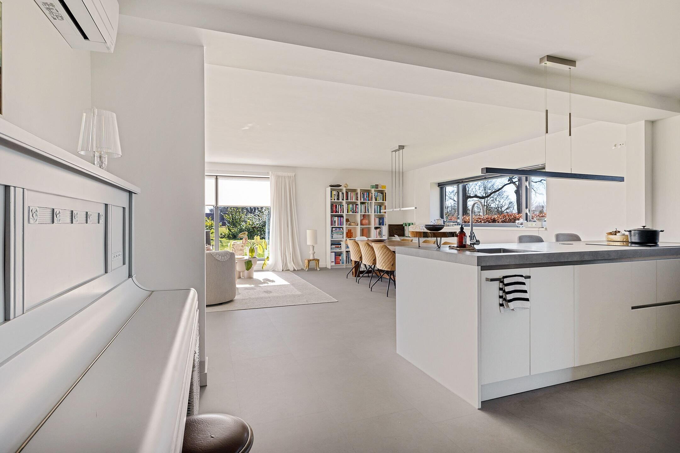 De woonkamer/keuken heeft veel lichtinval door de grote raampartijen die uitzicht bieden op de tuin en weilanden. In het plafond zijn elektrisch bedienbare kantelramen aangebracht en het geheel is voorzien van vloerverwarming.