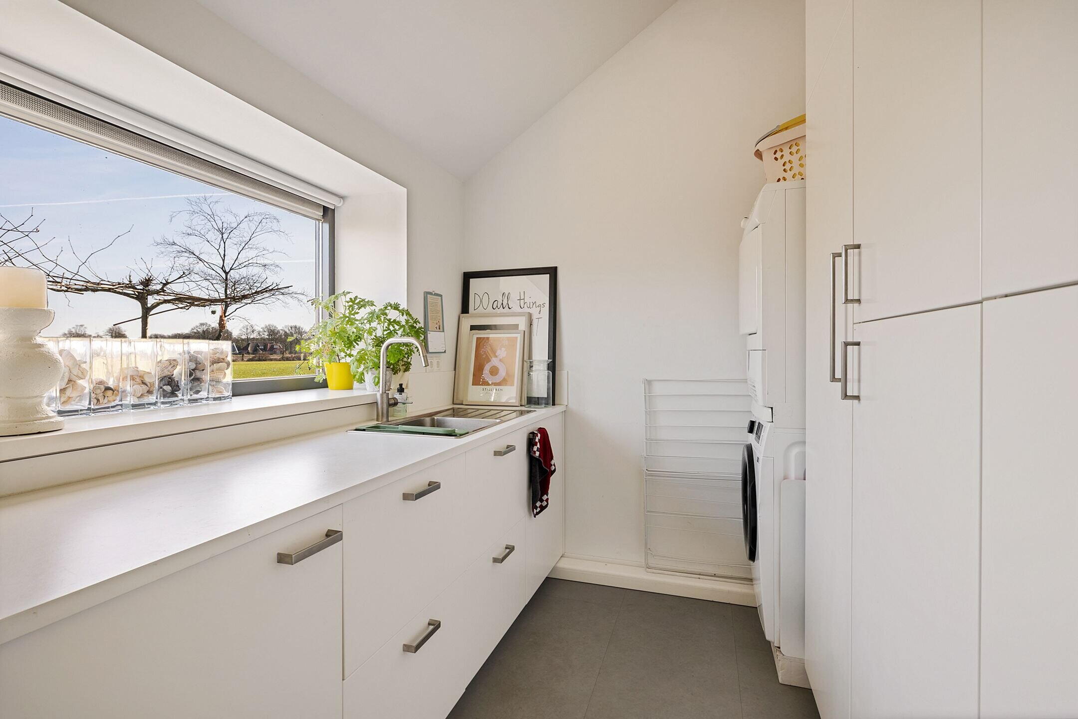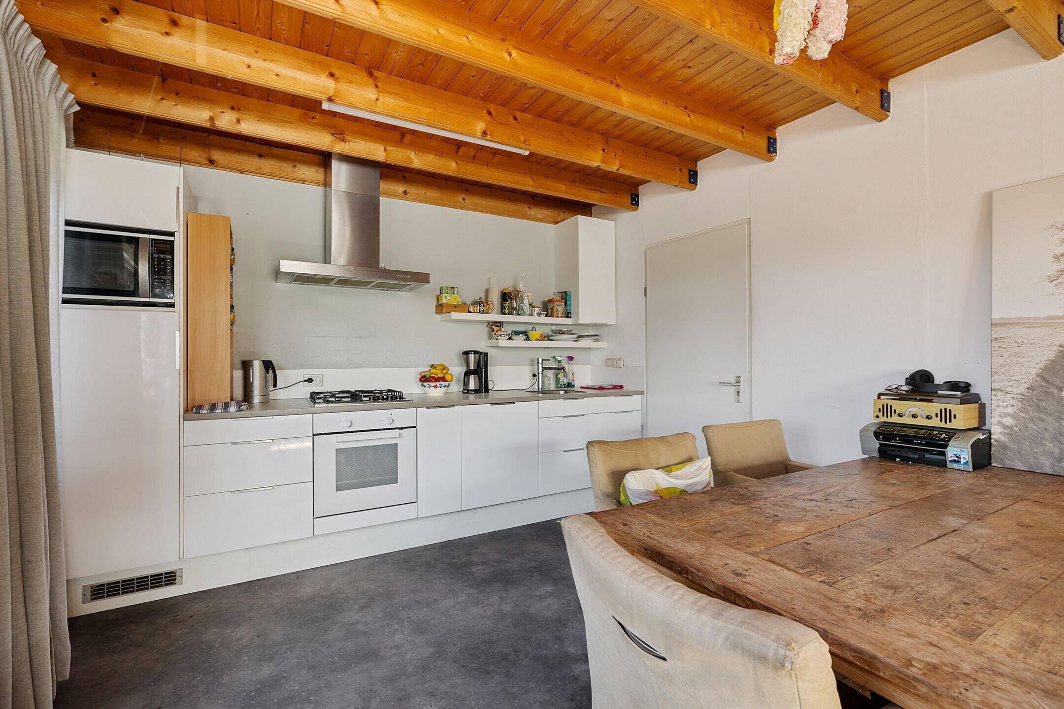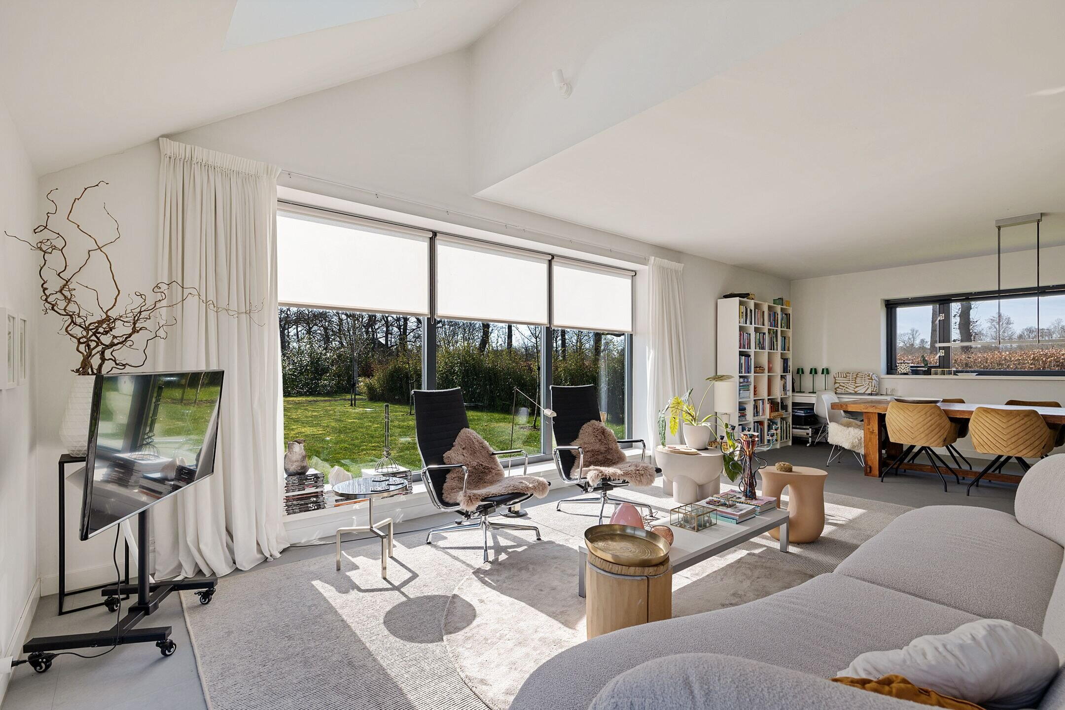 De woonkamer/keuken heeft veel lichtinval door de grote raampartijen die uitzicht bieden op de tuin en weilanden. In het plafond zijn elektrisch bedienbare kantelramen aangebracht en het geheel is voorzien van vloerverwarming.