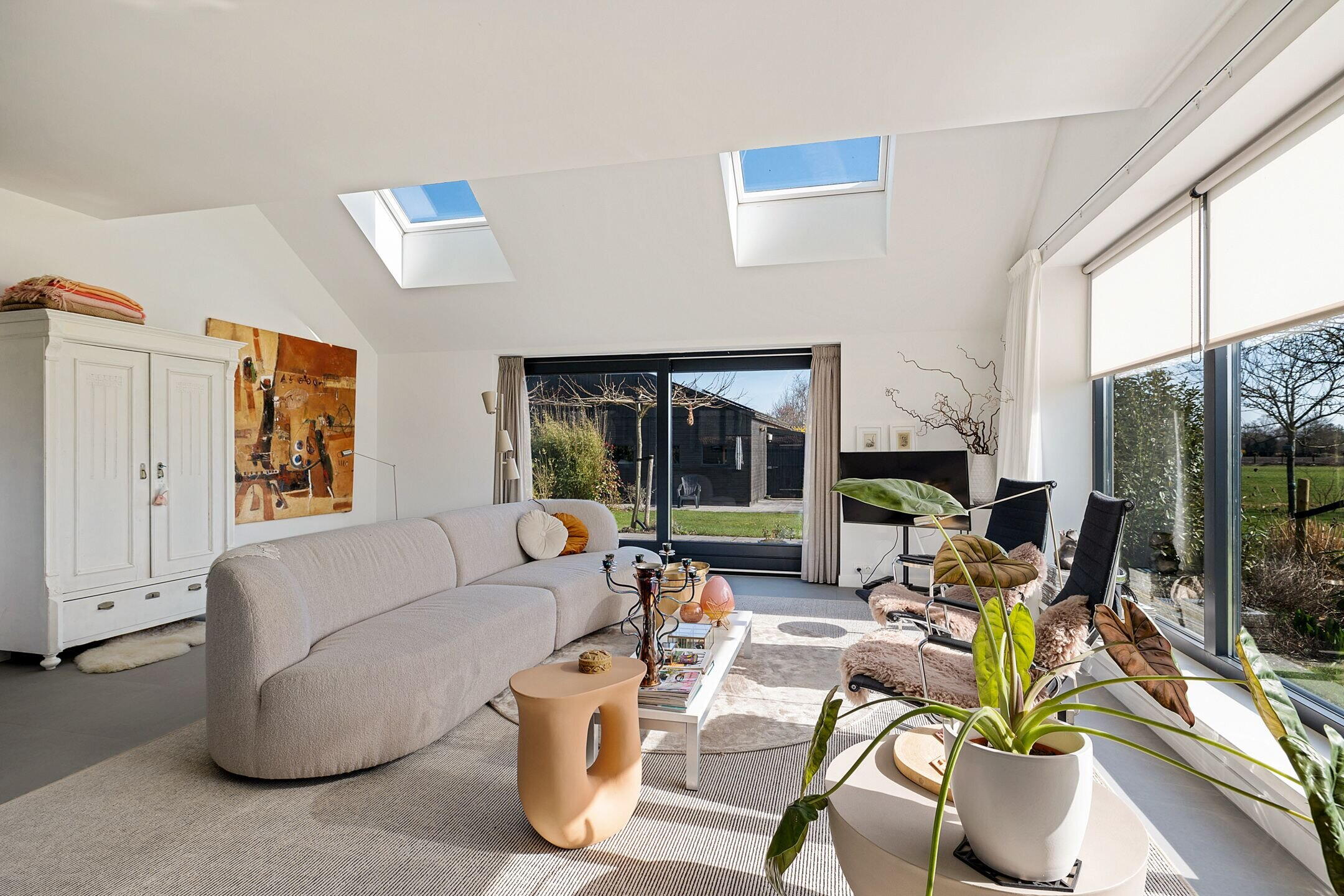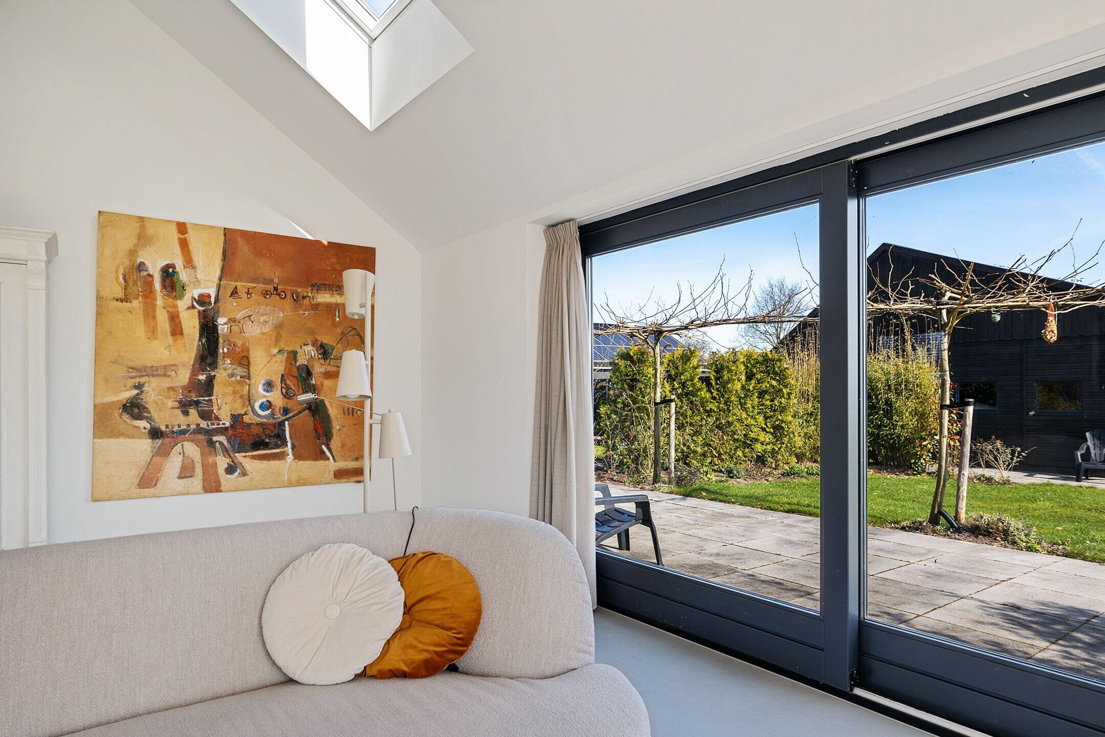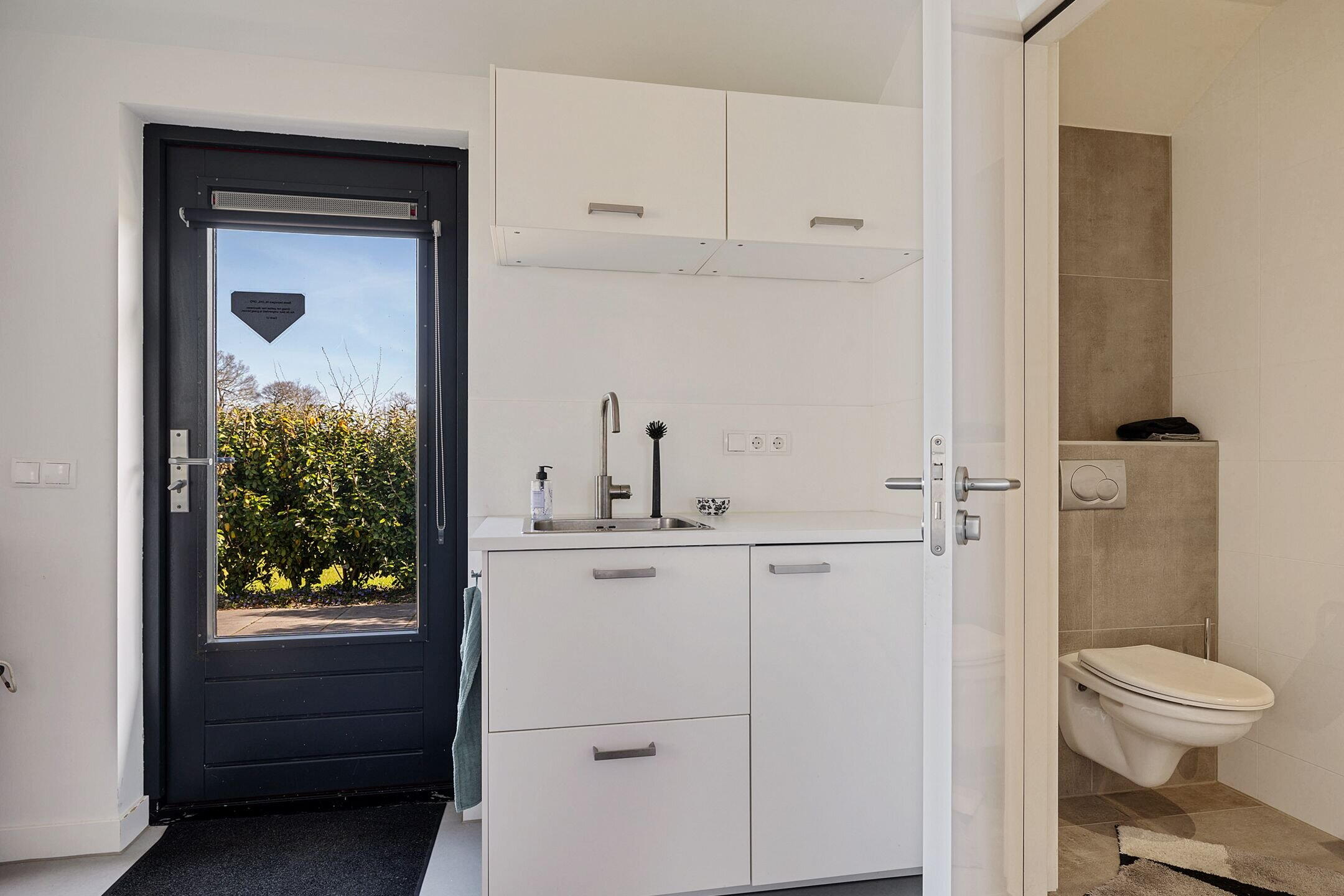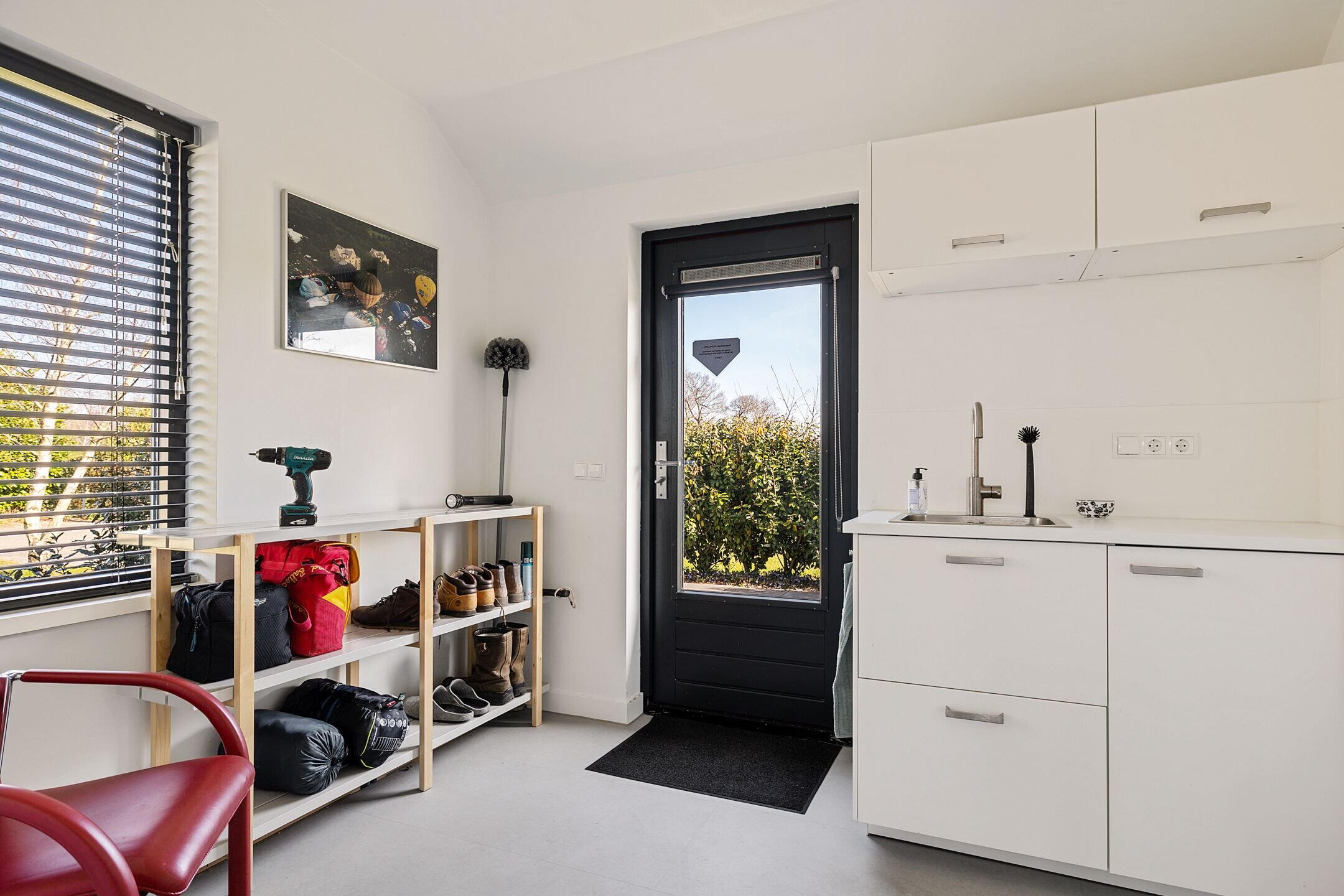 De woonkamer/keuken heeft veel lichtinval door de grote raampartijen die uitzicht bieden op de tuin en weilanden. In het plafond zijn elektrisch bedienbare kantelramen aangebracht en het geheel is voorzien van vloerverwarming.