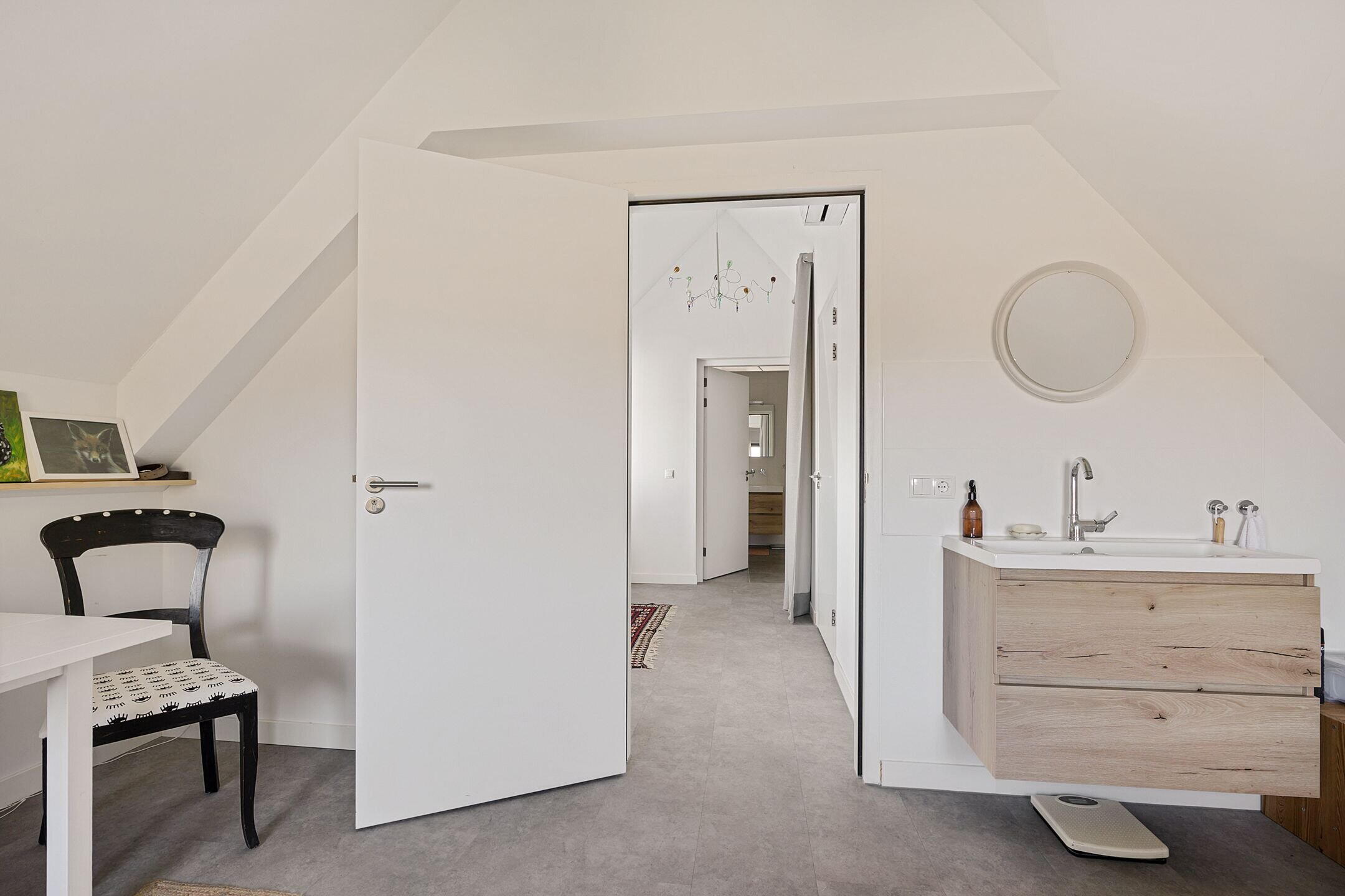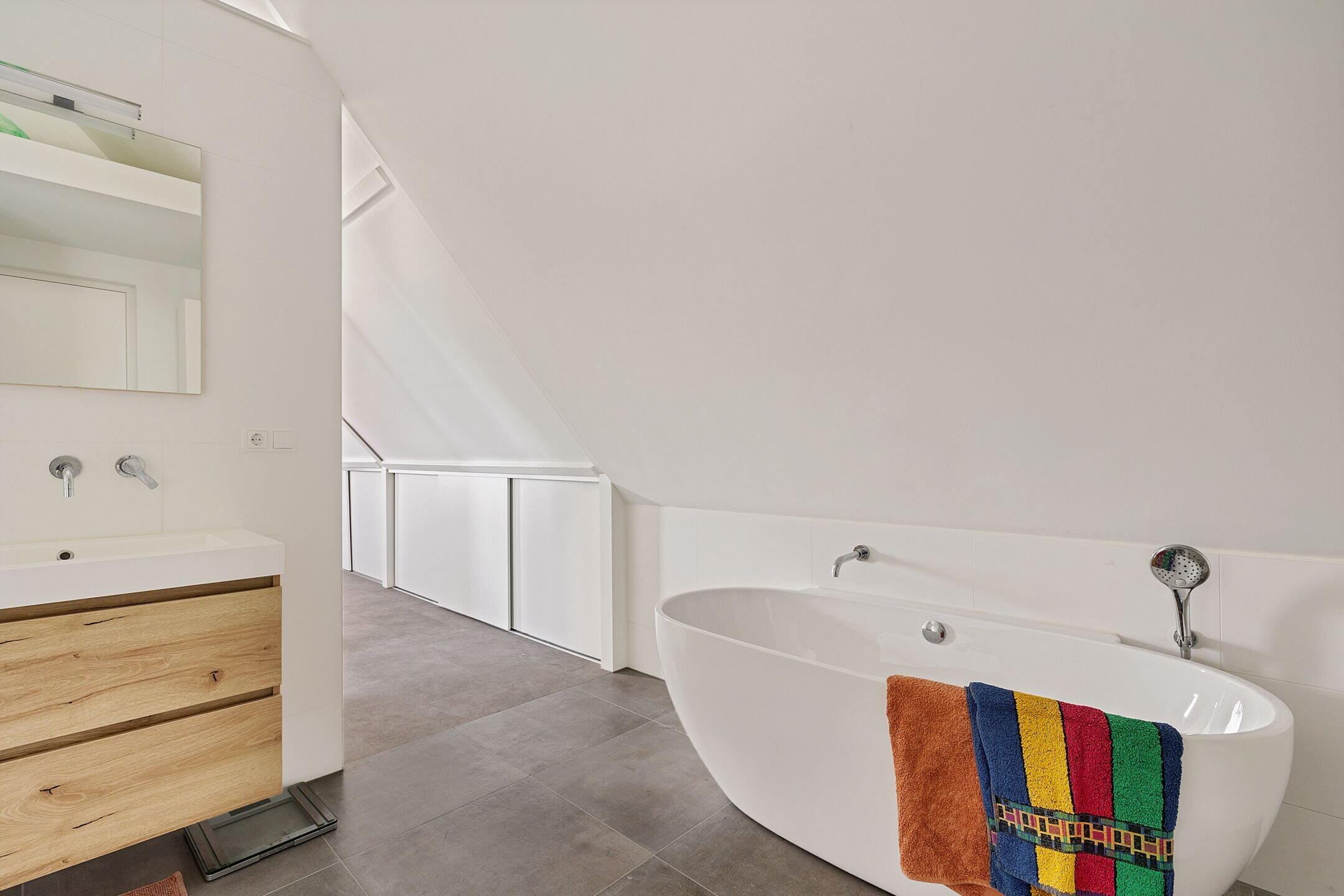 Etage: ruime overloop met dak serre, waar u eventueel een extra slaapkamer of werkplek kunt creëren. Aansluitend bevindt zich een badkamer met douche, derde toilet en urinoir en een slaapkamer van 11 m². De grote ouderslaapkamer is speels ingedeeld en heeft een halfopen luxe badkamer met ligbad, grote inloopdouche en een dubbel wastafelmeubel (samen groot 30m²).