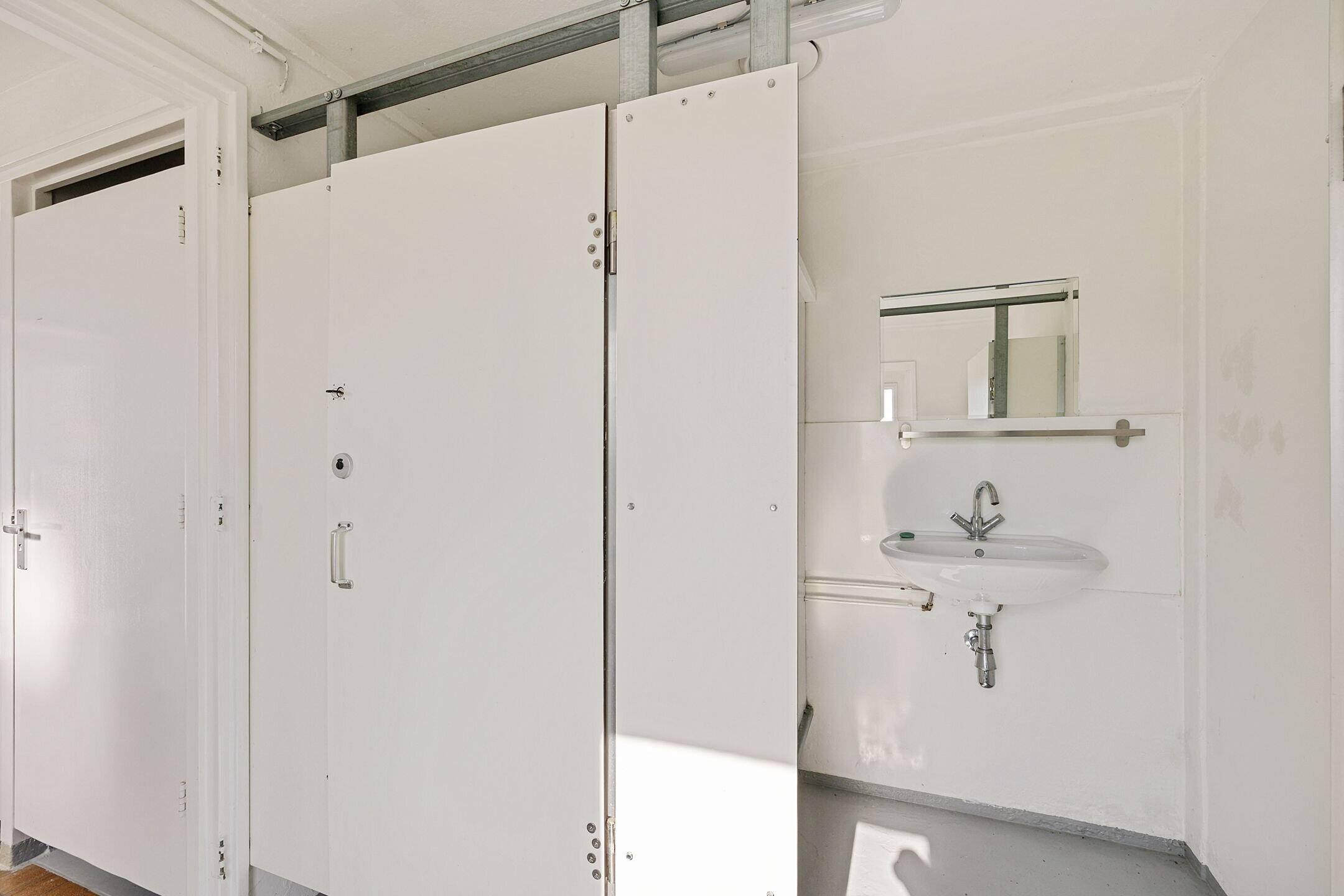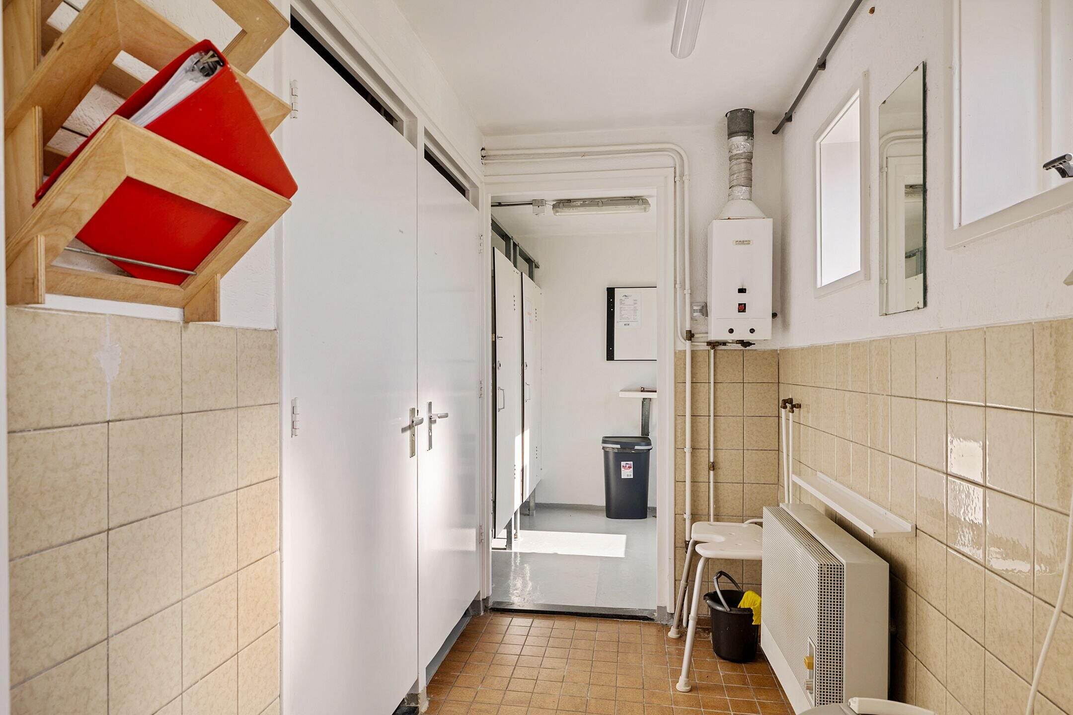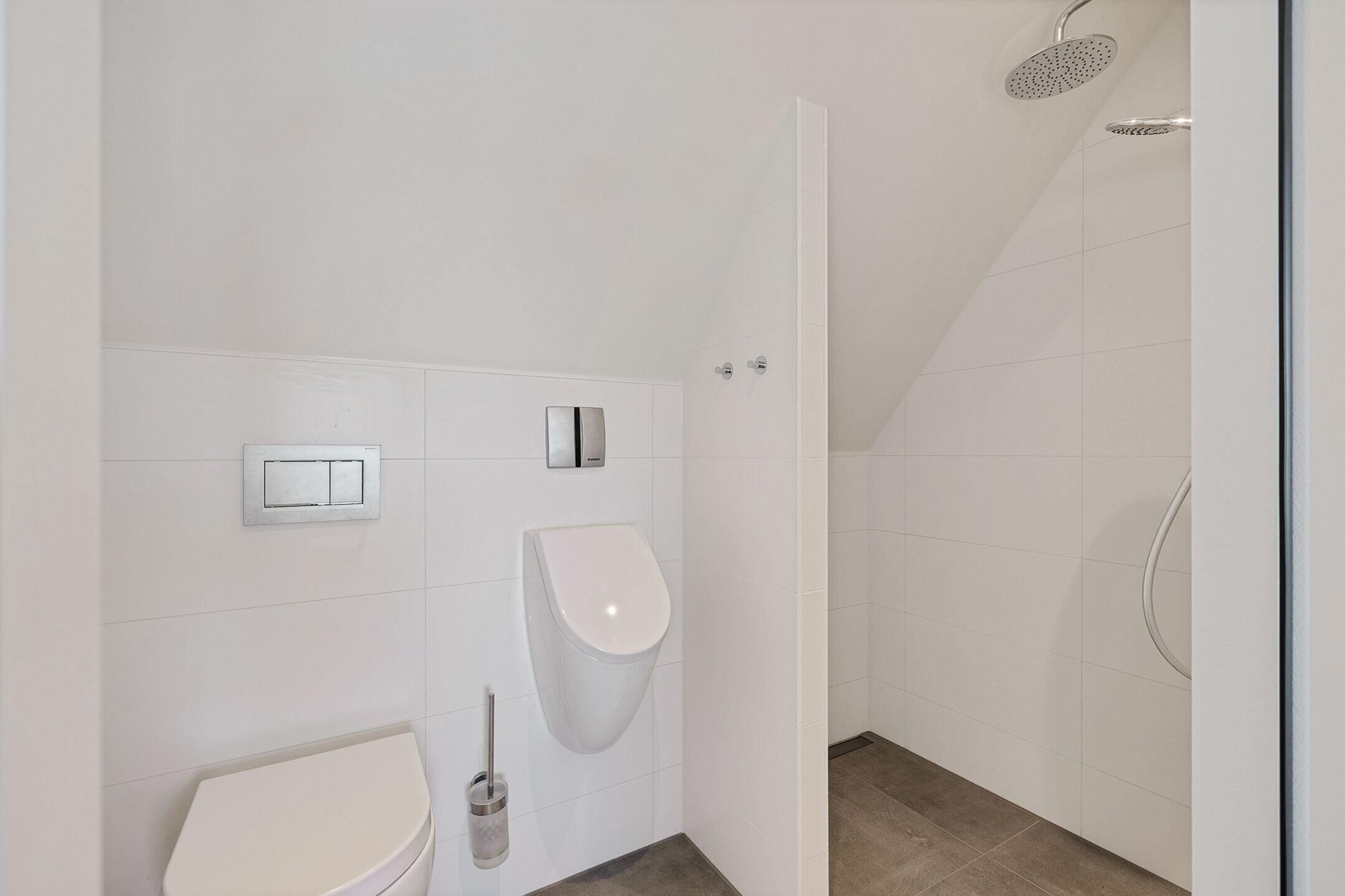 - 3 douches, 2 toiletten, wastafel, urinoir, ligbad, en wastafelmeubel