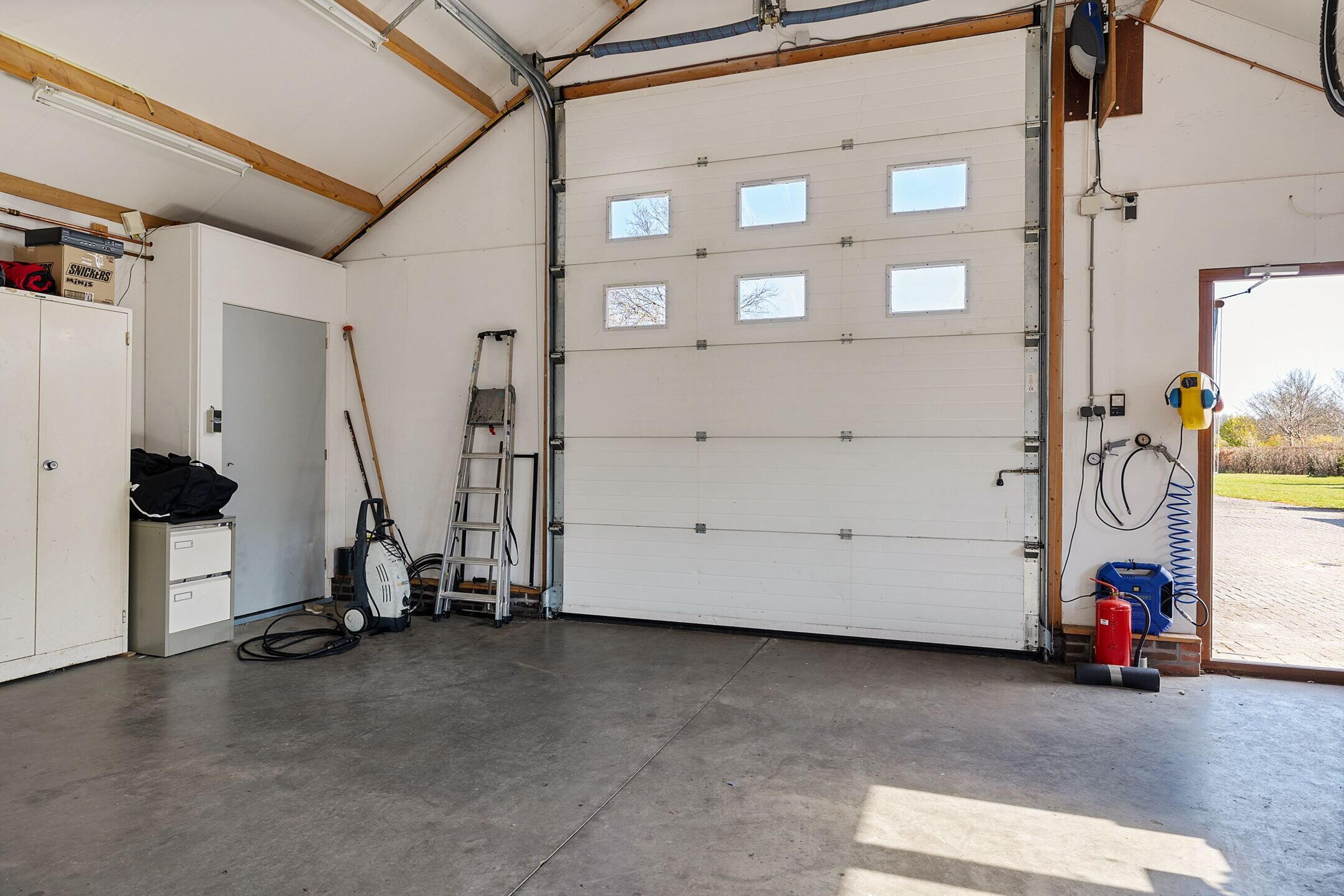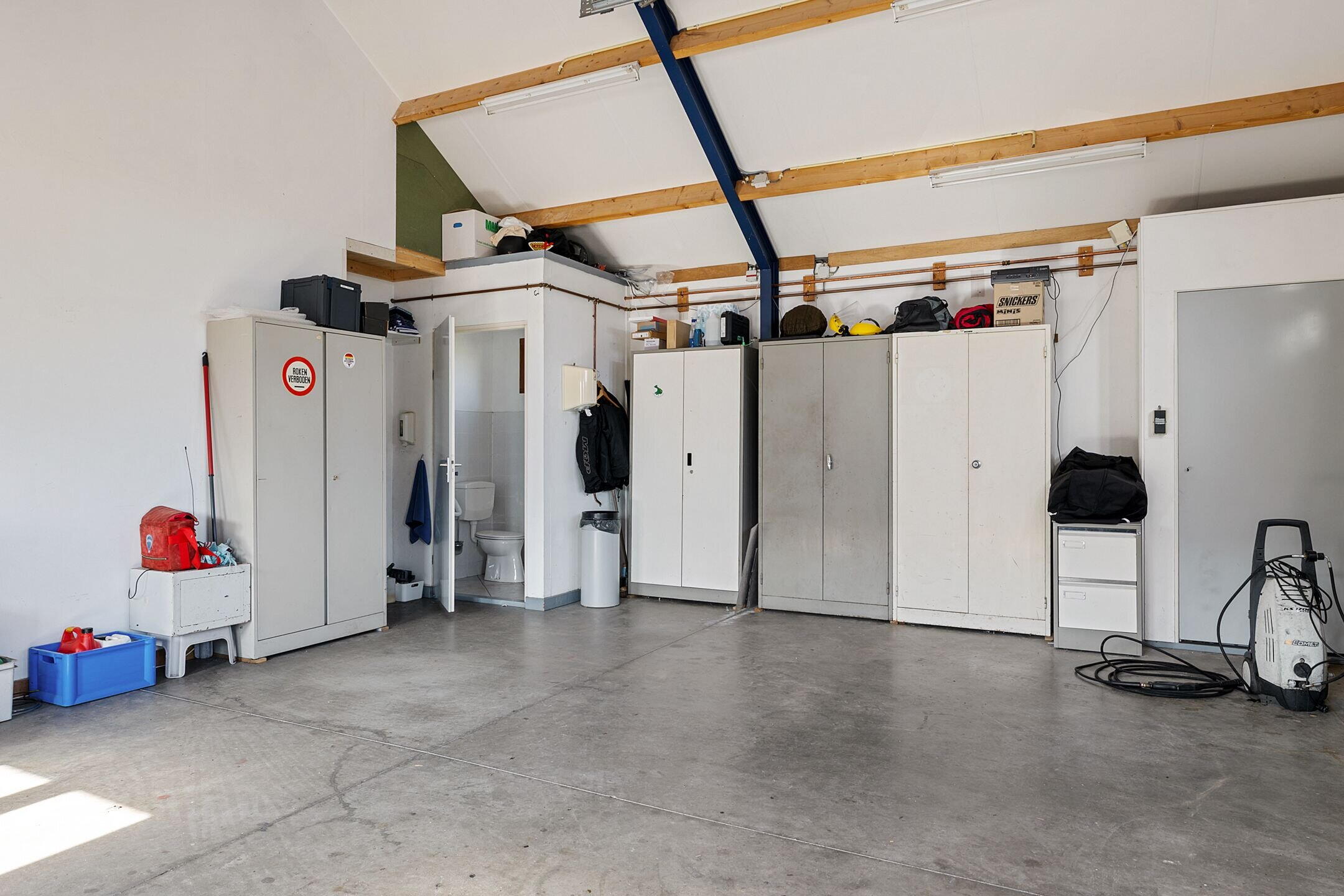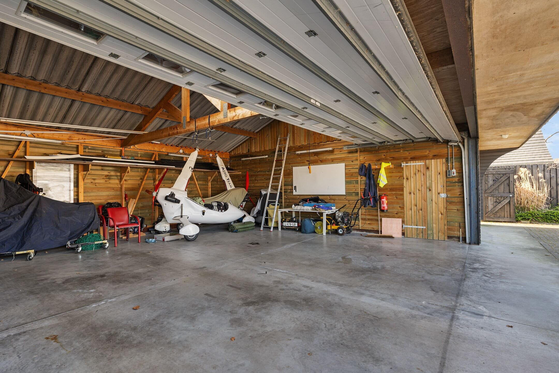 Aan de achterzijde van dit gebouw bevindt zich nog een grote schuur/hangar met toilet en een elektrisch bedienbare overheaddeur van 4,5 meter hoog, ideaal voor bijvoorbeeld het stallen van uw camper.