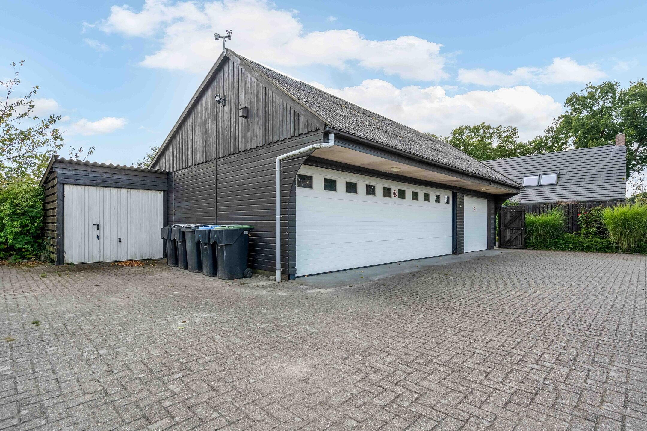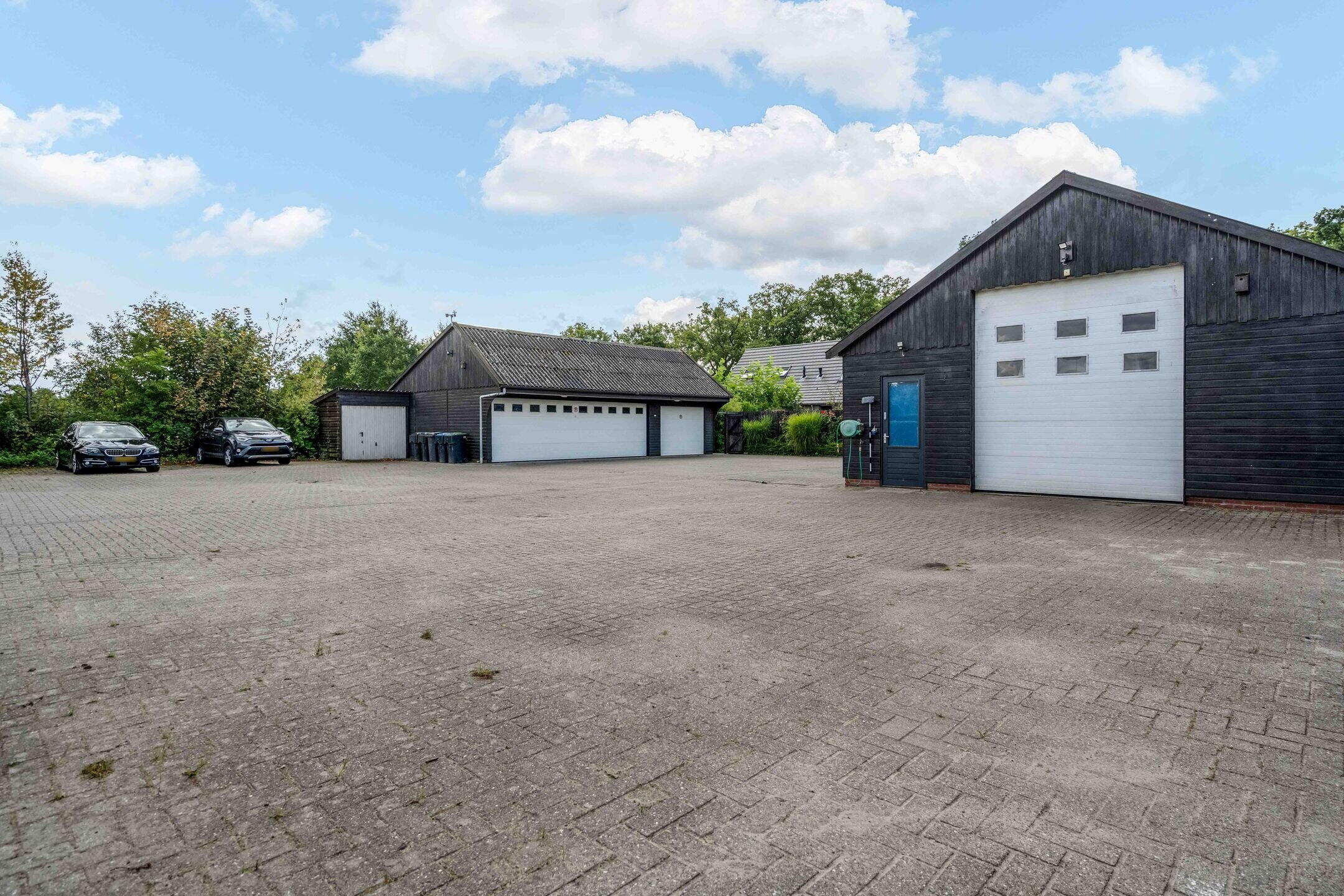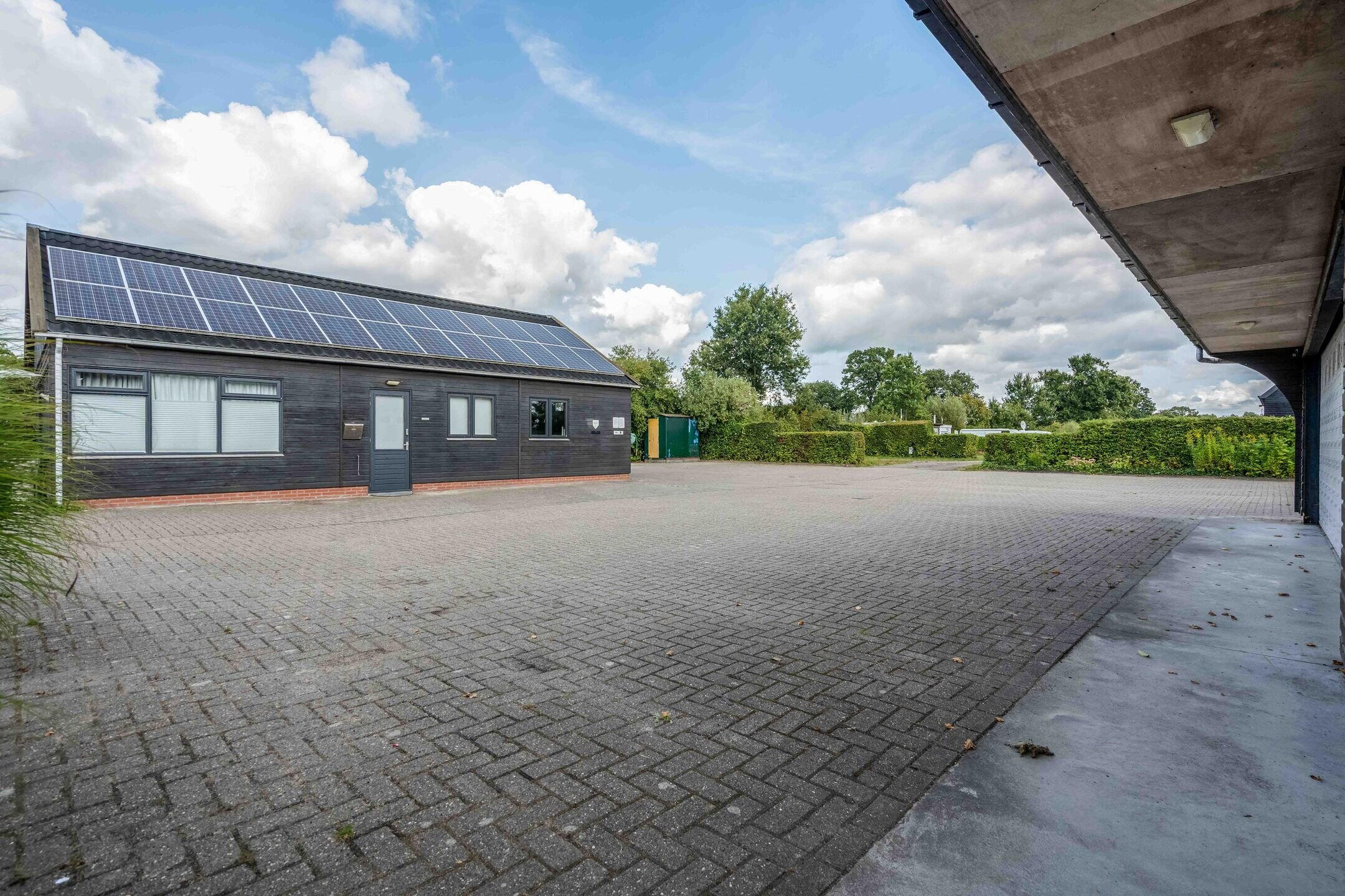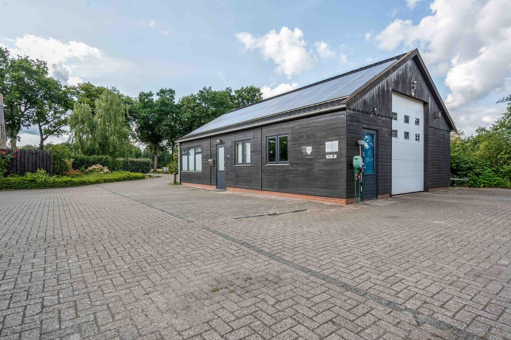 Aan de achterzijde van dit gebouw bevindt zich nog een grote schuur/hangar met toilet en een elektrisch bedienbare overheaddeur van 4,5 meter hoog, ideaal voor bijvoorbeeld het stallen van uw camper.